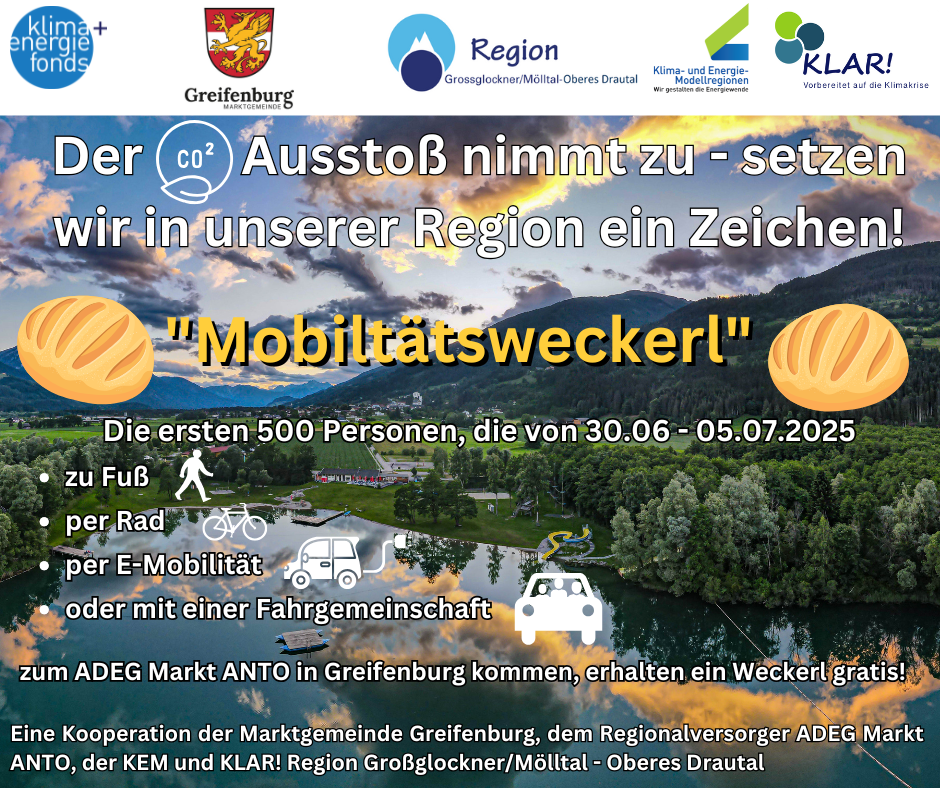 Mit dem Projekt „Mobilitätsweckerl“ setzen die Gemeinden Berg im Drautal, Greifenburg, Sachsenburg und Reißeck gemeinsam mit der KEM und KLAR! Großglockner/Mölltal – Oberes Drautal ein Zeichen für klimafreundliche Mobilität. Wer seine Einkäufe zu Fuß, mit dem Rad oder per E-Mobilität erledigt, erhält in den Partnerbetrieben ADEG Pirker, ADEG Anto, ADEG Prax und SPAR Granegger ein Gratis-Weckerl. Insgesamt wurden 500 Stück an klimabewusste Kund*innen vergeben. Die Aktion macht sichtbar, wie wichtig nachhaltige Fortbewegung im Alltag ist. Ein Beitrag jedes Einzelnen für eine emissionsfreie Zukunft.